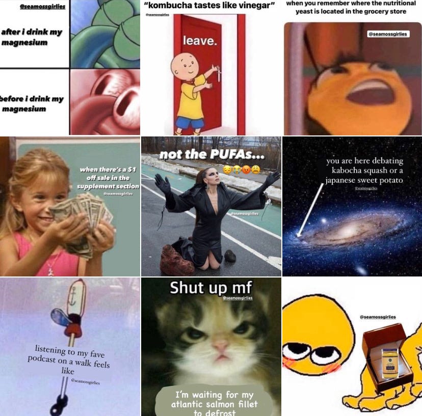 At this very moment, GOOP as a publication is being disrupted by an equal parts podcast, meme account and professional shitposters, Sea Moss Girlies, founded by Kate Glavan, and Emma Roepke, it’s the go to wellness page and community for GenZ. My prediction is that they will become more relevant than GOOP in the next few years, as they speak their generation’s language, better than Millennials could ever translate it, their wit is undefeated, and their posts garner thousands of likes organically and have attracted over 20K followers. Their memes aren’t your cutesy, basic meme, they are disorderly in a good way, a big fuck you to pretty “vibes” and aesthetics that have long permeated the “Girlboss” type of publications, they are the best kind of meme dealers, and part of the counter culture movement in favor of gross aesthetics.